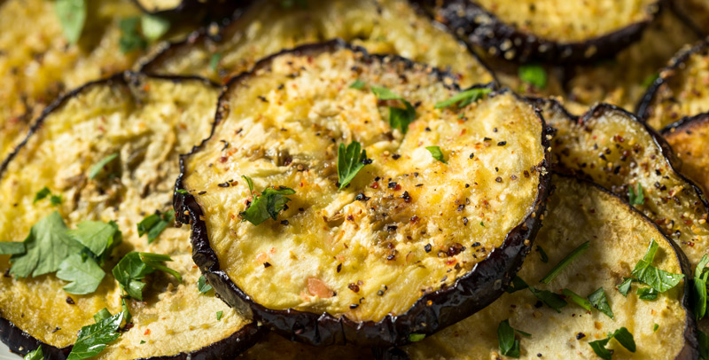 • Se incalzeste cuptorul la 240 grade C. Se spala vinetele si taie felii de 2-3 cm, apoi se ung cu uleiul de masline si se asezoneaza cu sare si piper. Se aseaza intr-o tava pe un singur strat si se lasa in cuptor 40-45 minute pana capata o culoare aurie inchisa. Se scot